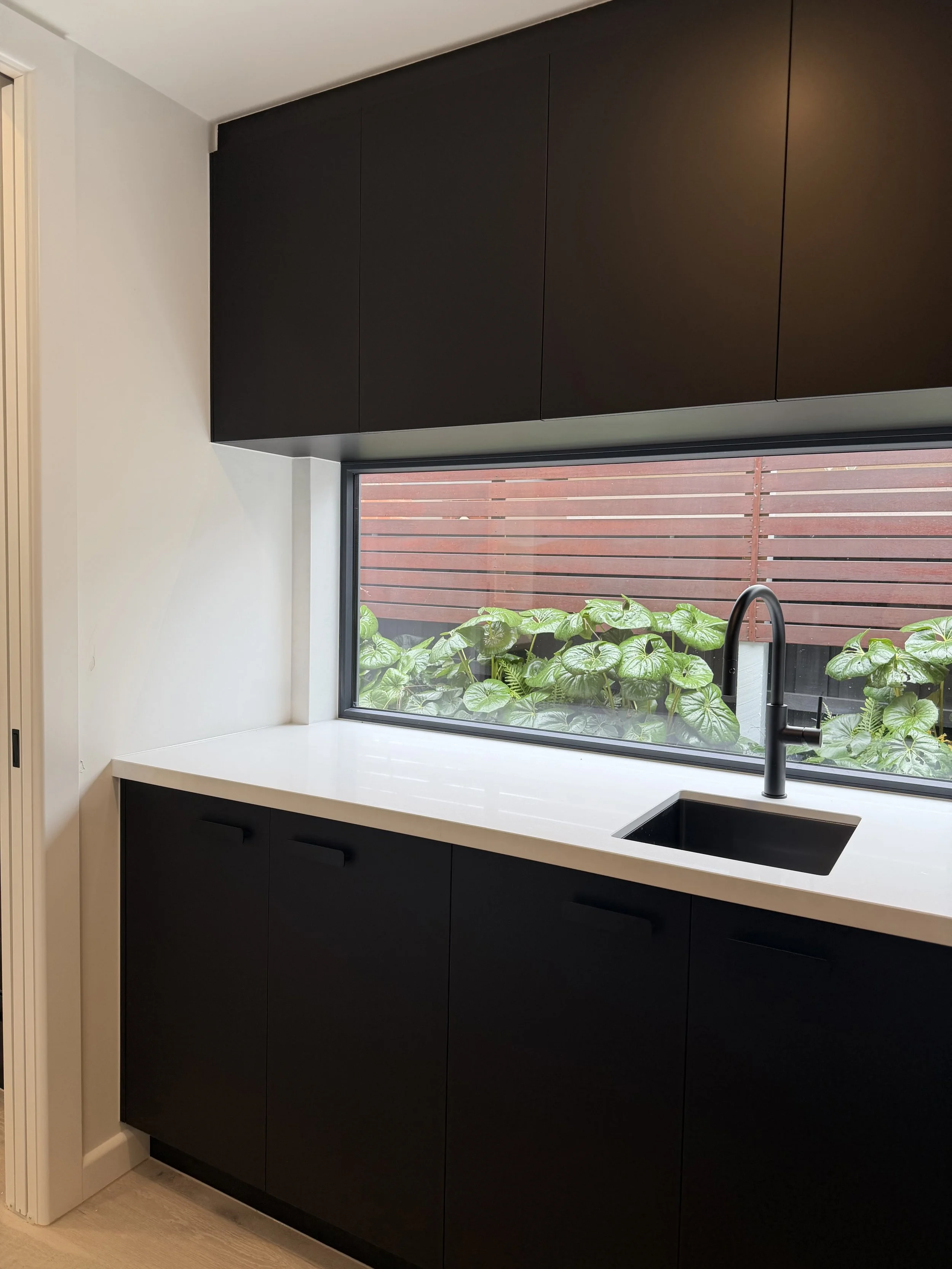 The benchtops are from our Builder’s Range — a white speckled surface that adds subtle texture and durability, perfect for everyday use. Black square pull handles and sleek black appliances provide a bold contrast, giving the space a modern edge.